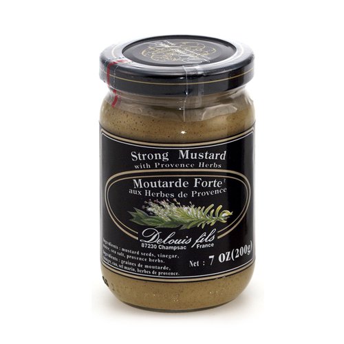 Strong Mustard with Herbs de Provence - 7 oz in Jar by Delouis Fils, France. 100% all natural - no synthetic additives, no preservatives. Ingredients: mustard seeds, vinegar, water, sea salt, Provence herbs. Refrigerate after opening.